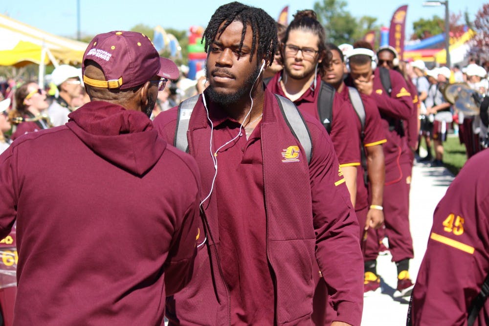 Central Michigan defensive end Mike Danna walks into Kelly/Shorts Stadium for CMU's game against Maine on Sept. 22, 2018.