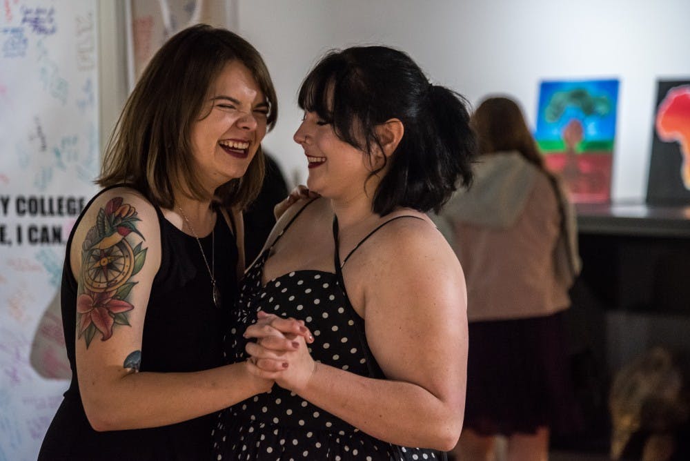 Calumet junior Olivia Torala, right, and her date Olivia Campbell of Mount Pleasant dance at the Gender and Sexuality Alliance Spectrum's Pride Prom April 12 in the Center for Inclusion and Diversity at Bovee University Center. Torala said the two met the "way most people meet in 2019"-- through an online app.
