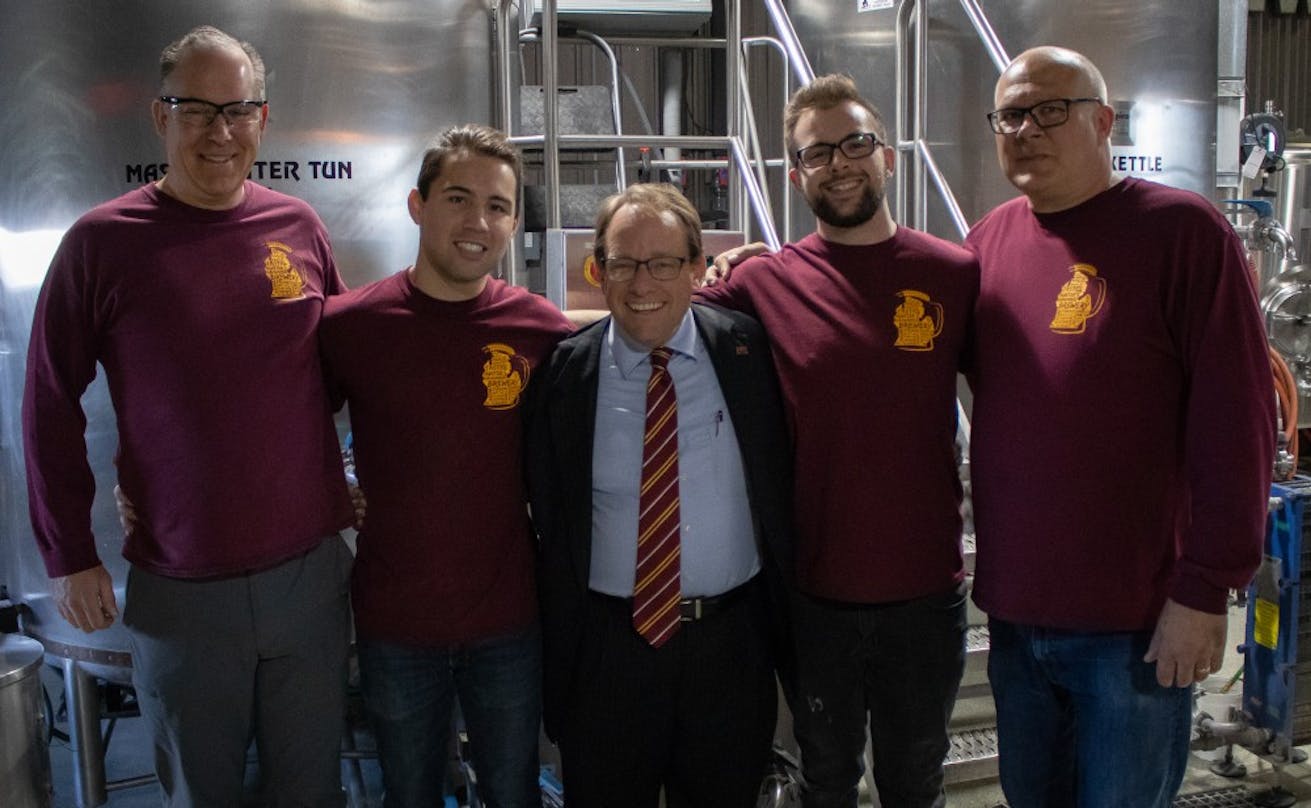 President Robert Davies poses with the student brewers of the fermentation science program at Hunter's Ale House April 12.