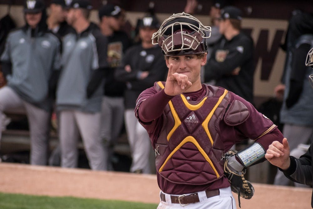 Sophomore catcher Griffin Lockwood-Powell signals to the dugout as CMU Men's Baseball Team faces Western Michigan April 17 at Theunissen Stadium.