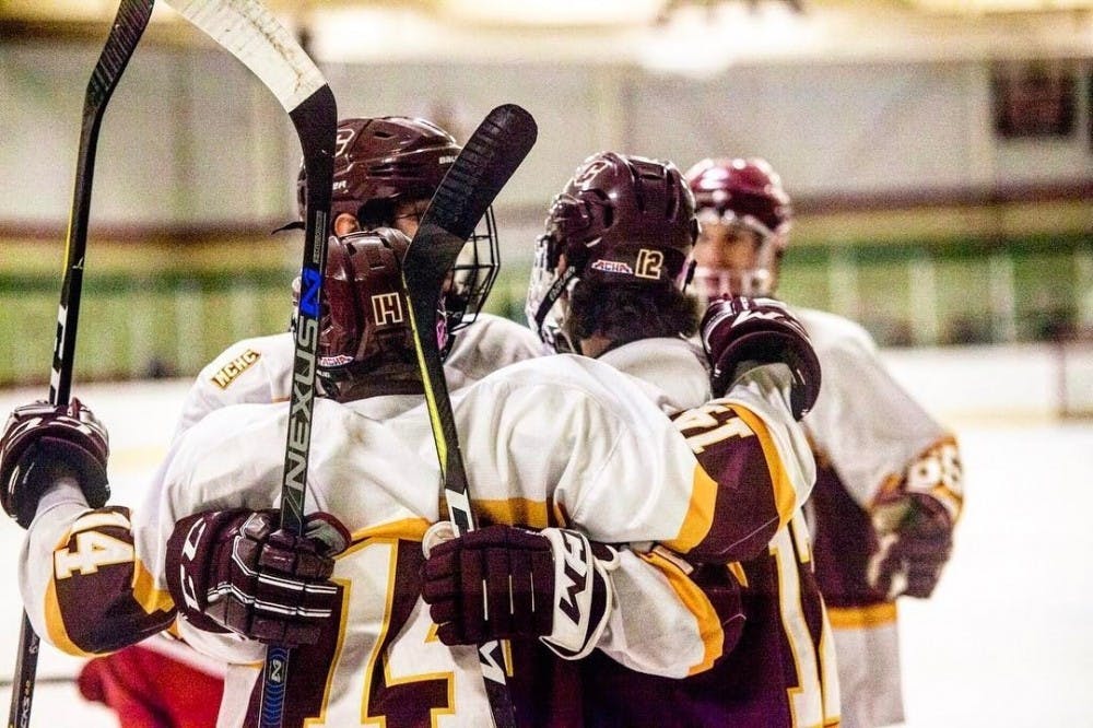 Members of the Central Michigan University Division III men's club hockey team gather for a hug.