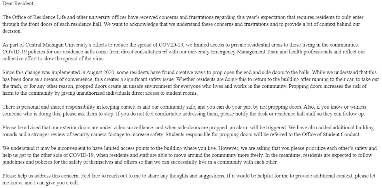 The policy kept side doors locked to limit traffic entering and exiting residence halls.