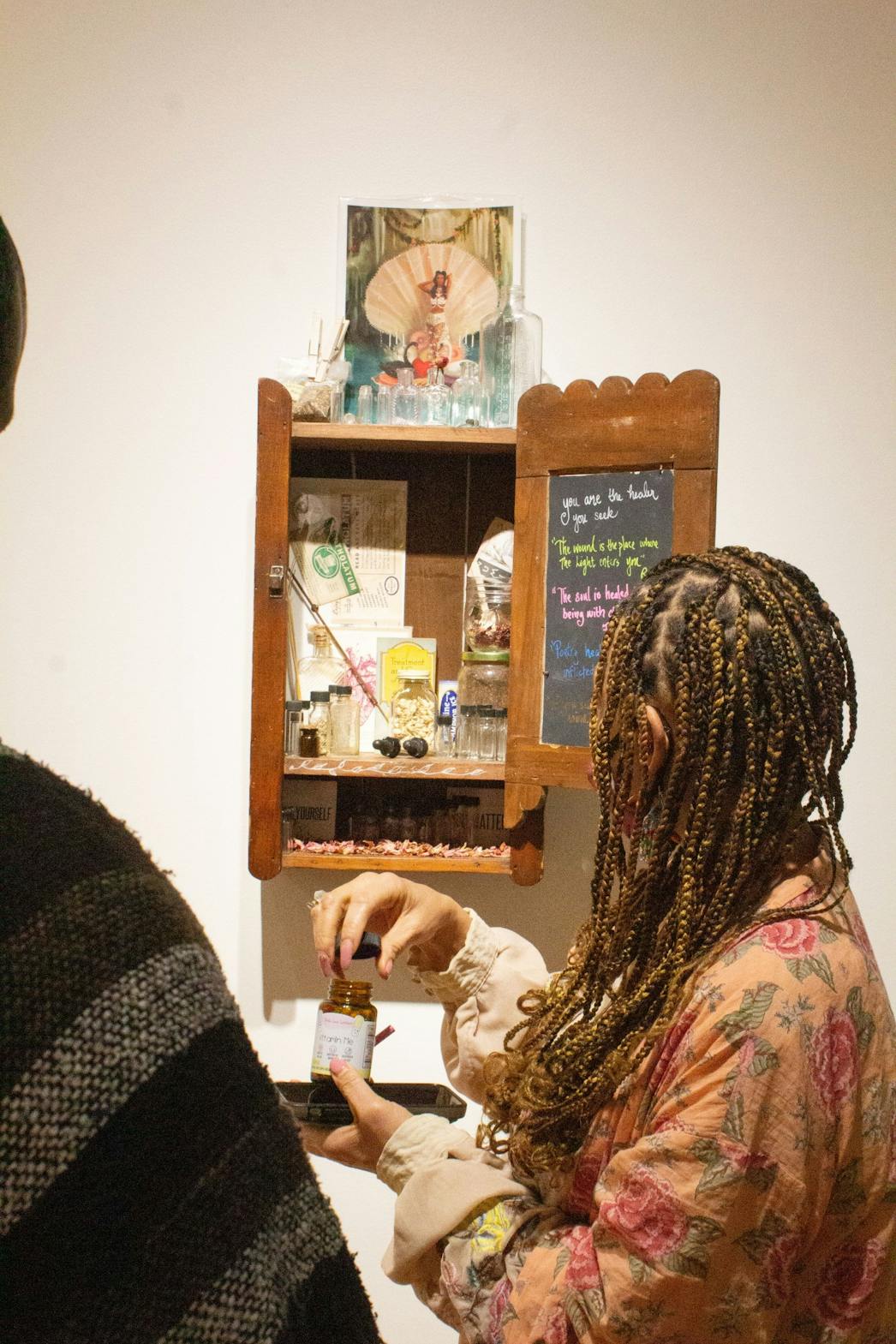 Inside of the cabinet sit old glass bottles with herbs and dried flowers, yellowed medicine papers and motivational quotes about healing the soul. Nelson collected medicine containers from antique shops and picked flowers for the exhibition from a lavender farm in Saugatuck.