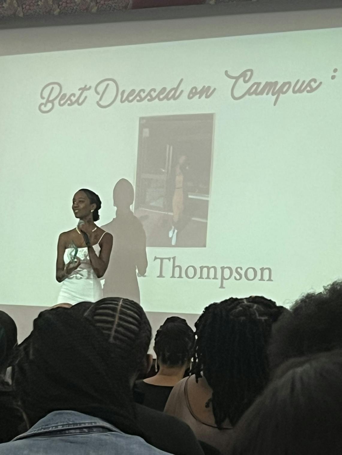 Genesia Thompson, senior double majoring in Sociology and Public and Nonprofit Administration gives an acceptance speech after winning the Aphrodite Award for Best Dressed.