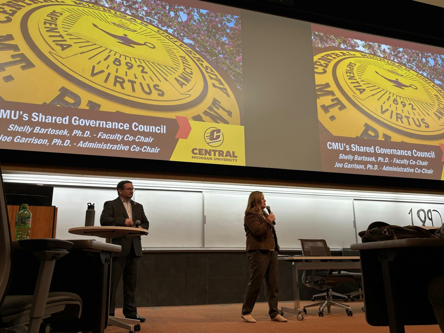 Joe Garrison and Shelly Bartosek, co-chairs of the Shared Governance Council at CMU, held a presentation explaining what the organization is and its role at the university.