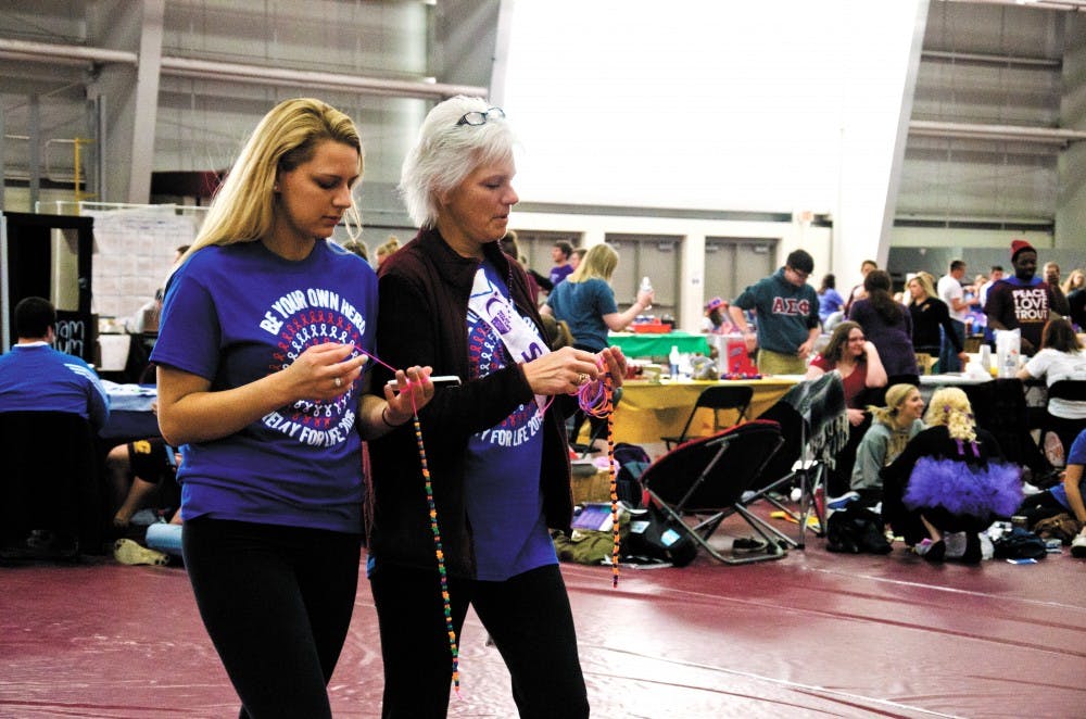 Corinne Ondraka, left, and Karen Hinckley, right, walk a lap at Relay for Life April 25 in the Indoor Athletic Complex.