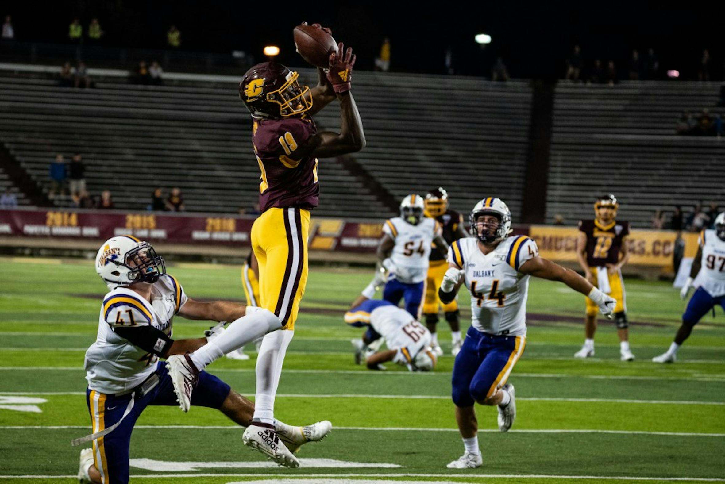 Central Michigan wide receiver Tyrone Scott catches the ball and scores the first touchdown of the season against Albany August 29 at Kelly Shorts Stadium.