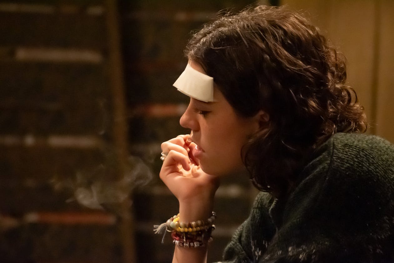 Freshman Mackenna Kofahl blows out smoke during rehearsals for The Birds, Tuesday, Sept. 26 at Theatre-On-The-Side. Kofahl plays Julia.