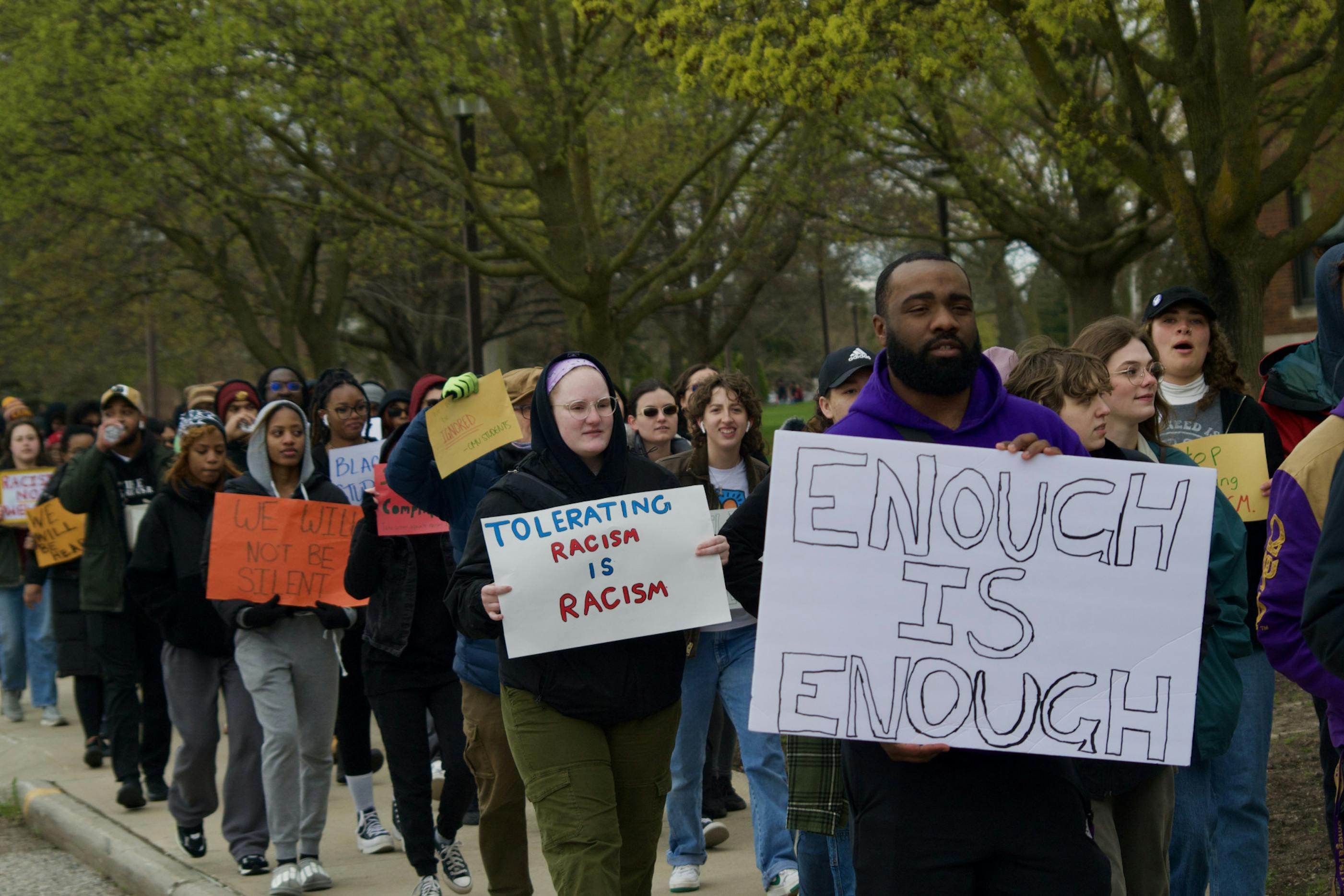 With a line that stretched from Anspach to Wesley, Central Michigan University students' voices bit through the cold air as their feet rhythmically hit the pavement alongside the highway. Passing tour groups and seniors in the midst of their graduation photoshoots stepped to the side to watch as protestors came by, their purpose echoing in the sounds of their steps and chants.