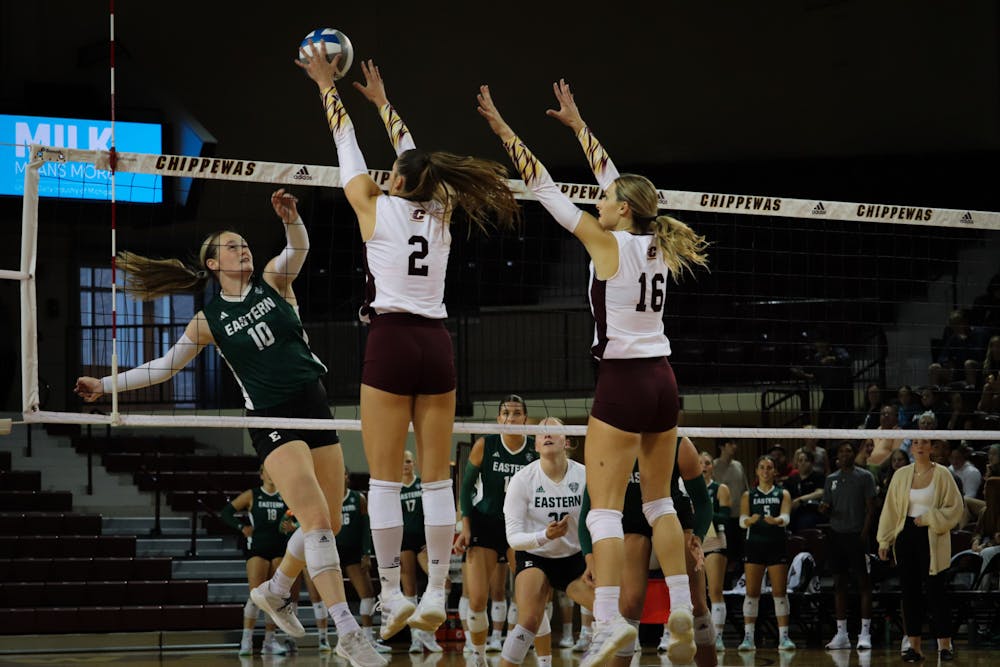 Central Michigan's junior outside hitter Natalia Rejment, left, and freshman middle guard Grace Thomas, right, block a hit from Eastern Michigan's graduate student opposite/setter Maddie Stayer during the game Tuesday, Oct. 1 in McGuirk Arena. (CM-Life | Mary Nowosacki)