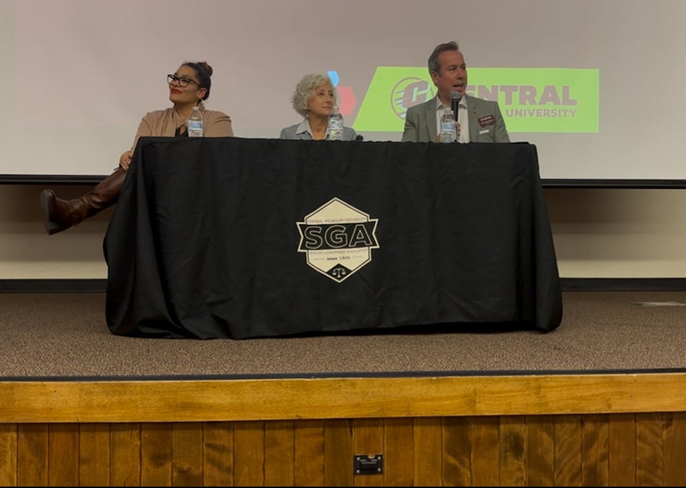 CMU President Neil MacKinnon, Provost Paula Lancaster and Dr. Shawna Patterson-Stephens sit on stage at the SGA Administration Town Hall on Nov. 24, 7:30 p.m. in Anspach 161