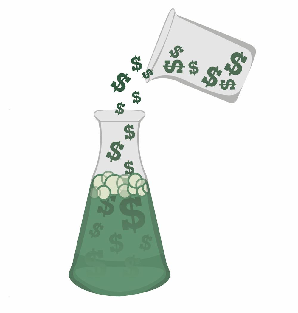 A beaker is having money poured into it, only to have it dissolve as the funding decreases for the science programs. Design by Paige Jaczkowski.