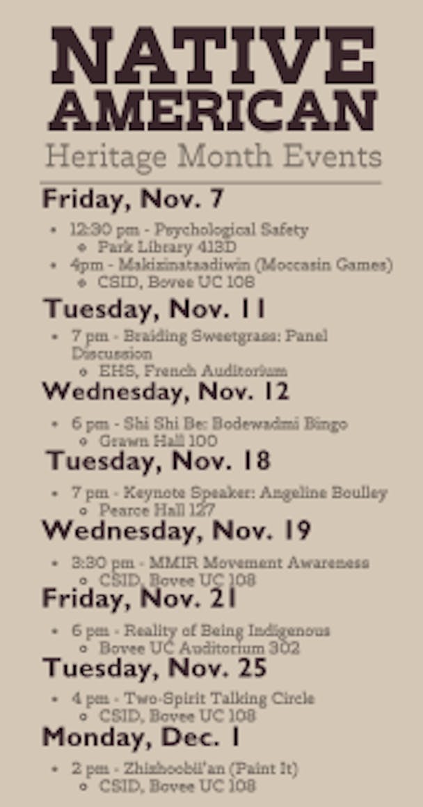 This month for NAHM at CMU, the Office of Indigenous Affairs will host several events for the campus community, including bringing New York Times Bestselling author Angeline Boulley to campus on Nov. 18, having fun with Shi Shi Be (Bodewadmi language bingo) on Nov. 12 and several opportunities to learn about art, food and traditional games throughout.
