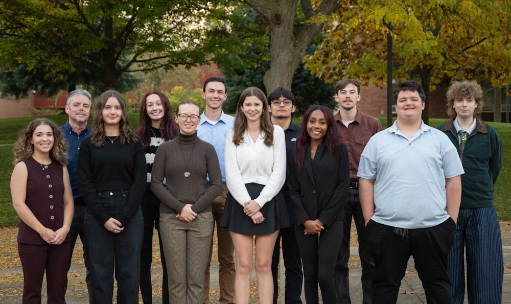 The Society of Professional Journalists poses between Moore Hall and the music building on Central Michigan University's campus. (Photo by Claire Vachon)