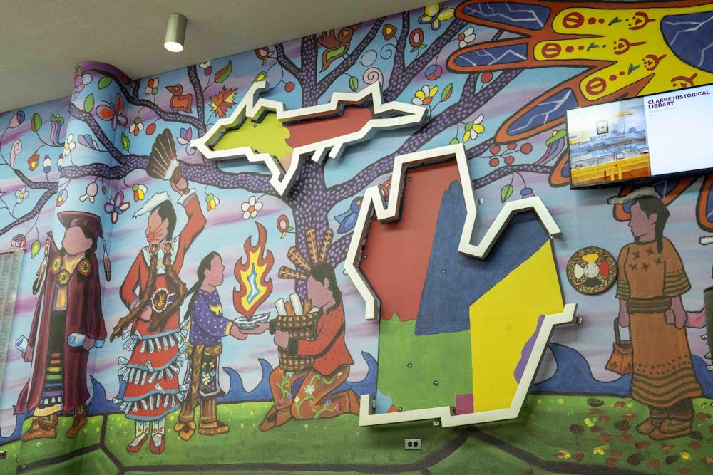 A mural on the wall of the Bovee University Center represents the history, current status, and prospects of Native American and Indigenous communities in Michigan and across North America on Monday, Oct. 27, 2025. The mural was unveiled on Oct. 10, 2022. (CMLife | Alivia Cranick)