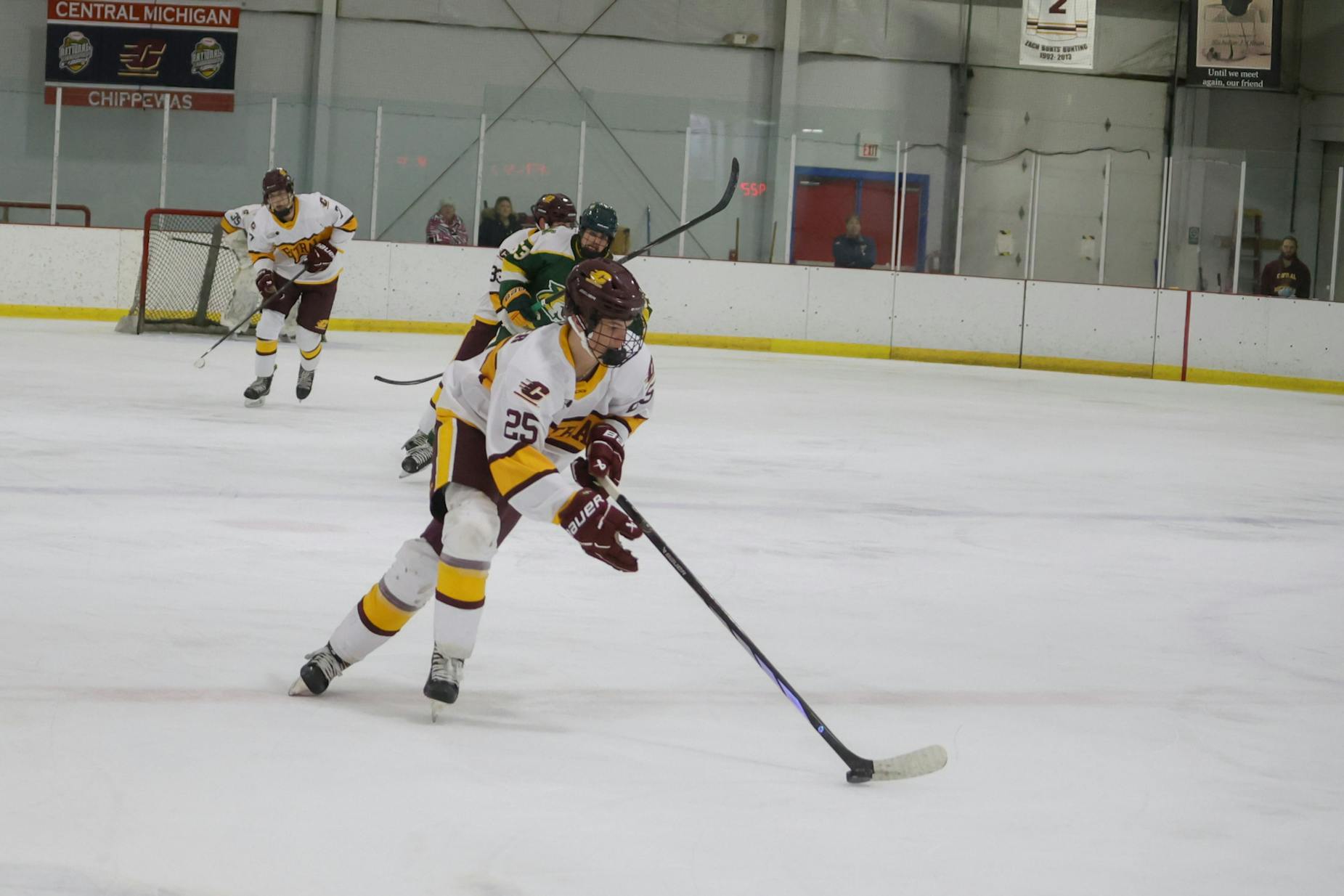 Central Michigan University freshman forward Drake Fletemier races towards the end of the rink, getting the puck closer to the goal at Martin Ice Arena, Friday, Nov. 7, 2025. Fletemier attempted no shots in the game against Northern. (CM Life | Jasmine Brookins)