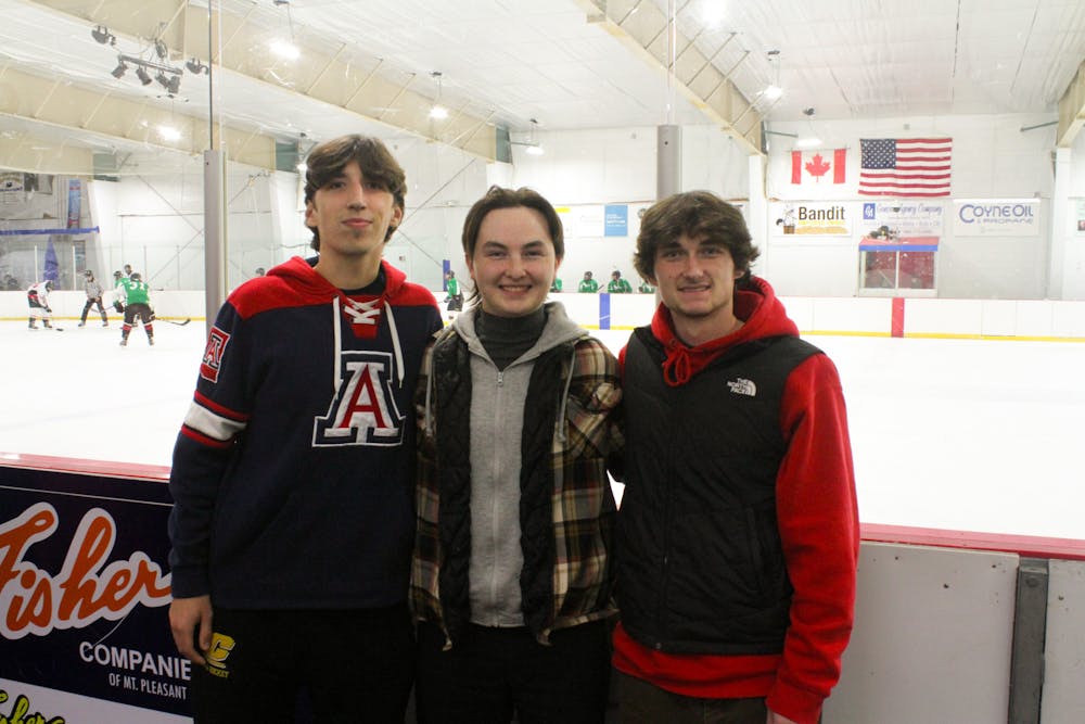 Aiden Reamer, Dylan Niermeyer, and Riley Joyce pose at Martin Ice Arena in Mt Pleasant on November 19, 2025. They are the primary members of the CMU ACHA Division 1 Club Hockey team's executive board. (CM Life | Chance Hamilton)