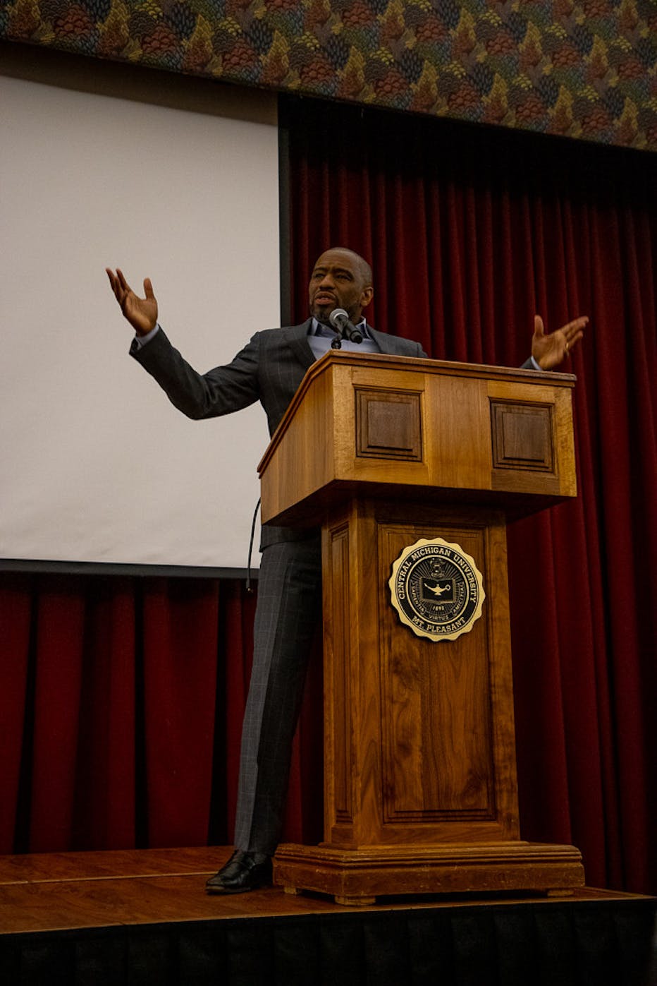 Keynote speaker for Black History Month 2026 Marc Lamont Hill delivers a speech in the Bovee University Center Rotunda, Wednesday, Feb. 11, 2026. The event was hosted by Central Michigan University's Multicultural Academic Student Services. (CM-Life | Cristin Coppess)