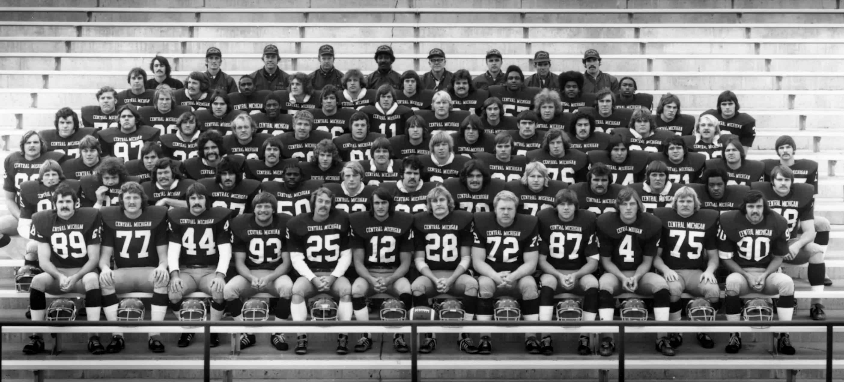 The 1974 CMU Football Team, Michael Woroniecki placed farthest right in the 4th row down. Courtesy CMU Athletics