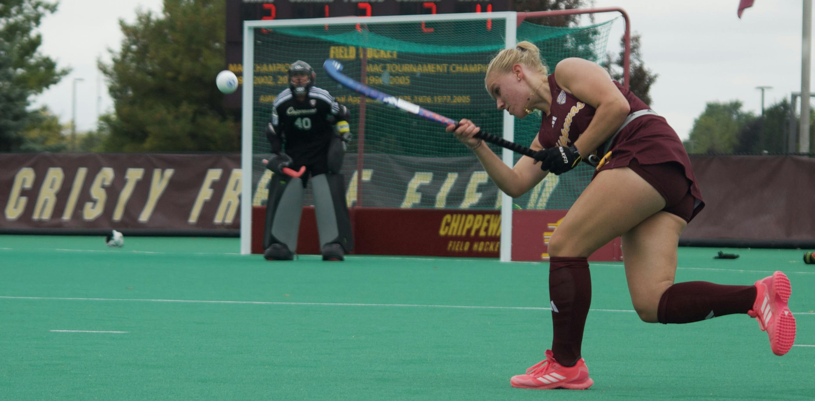 CMU freshman defender Pleun Van Gent hits the ball during field hockey at Cristy Freese Field on Friday, Sept. 19, 2025. In support of International Students' Day, fans learned that Van Gent is from the Netherlands. (CM-Life | Soli Gordon)