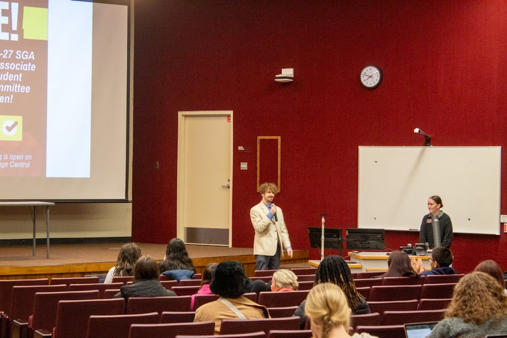 Carson Cooley talks about the Student Government Association elections at the SGA meeting on Monday, March 23, 2026.