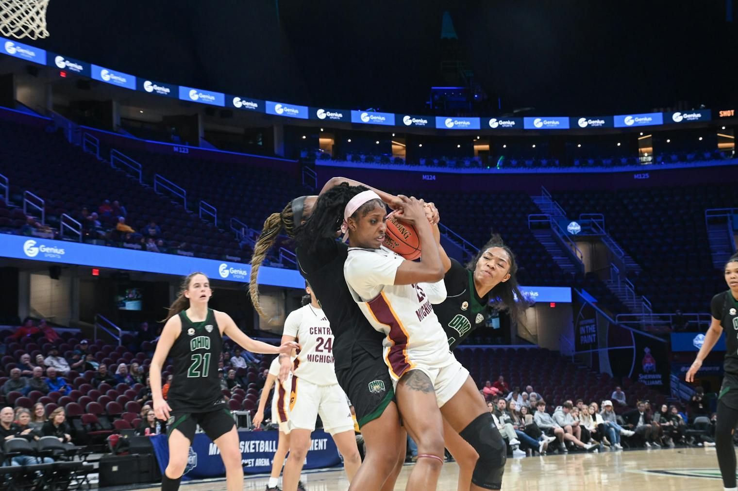 Central Michigan University sophomore forward Ayanna-Sarai Darrignton fights for the basketball during the Mid-American Conference basketball tournament against Ohio University at Rocket Arena in Cleveland, Ohio on Wednesday, March 11, 2026. Darrignton scored 20 points during the game. (CM-Life | Zoey Morse)