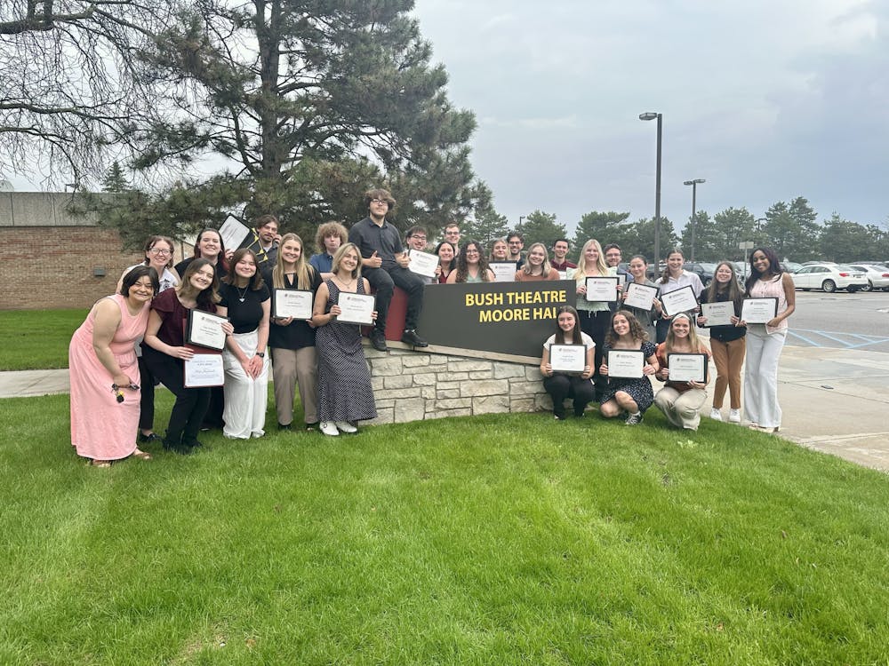 The Central Michigan Life team poses with its awards from the School of Communication, Journalism and Media on Friday, April 24, 2026. Photo by Kathy Simon.