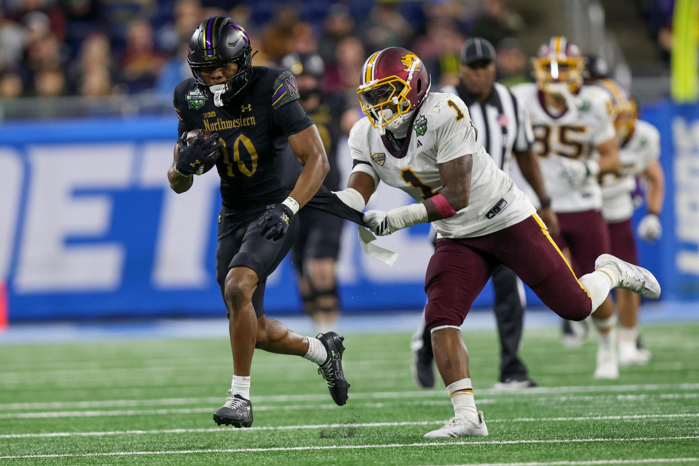 Central Michigan redshirt senior linebacker Dakota Cochran tackles Northwestern redshirt sophomore wide receiver Rickey Ahumaraeze during the GameAbove Sports Bowl between Central Michigan University and Northwestern University at Ford Field in Detroit, on Friday, Dec. 26, 2025. Cochran had five tackles in the game. (CM-Life| Mark Hoover)
