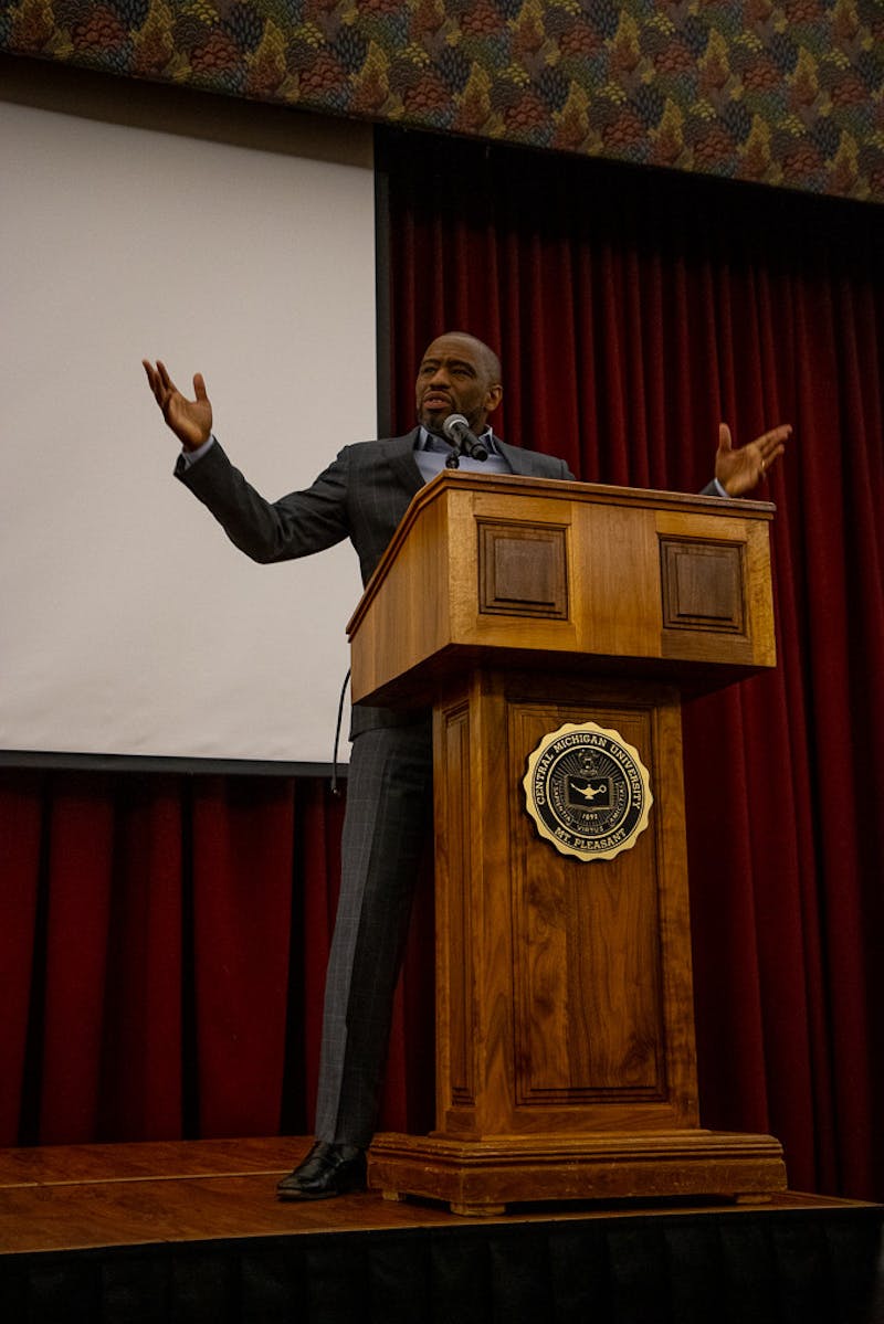 Dr. Marc Lamont Hill delivers a passionate speech to a crowd of Central Michigan University community members while serving as the keynote for Black History Month 2026 in the Bovee University Center Rotunda, Wednesday, Feb. 11, 2026.