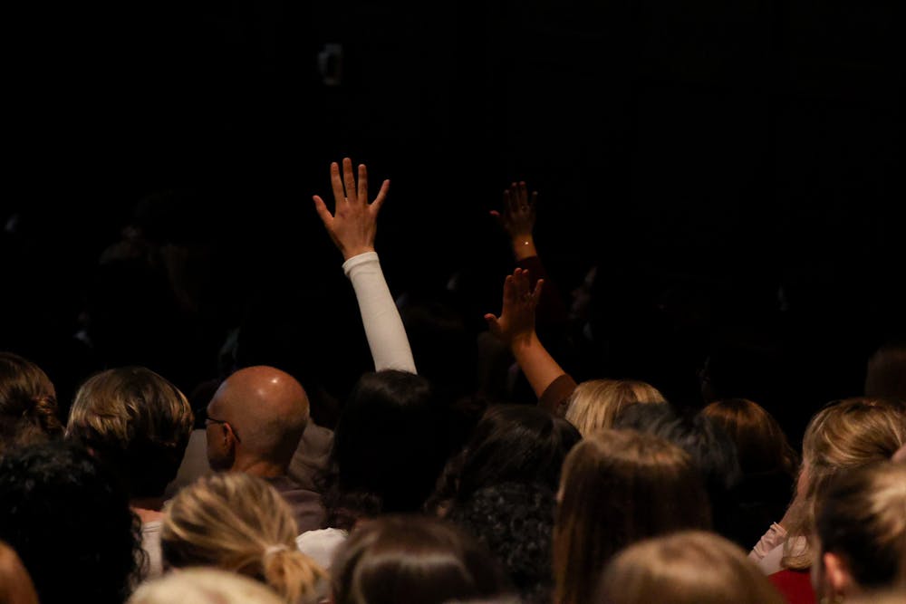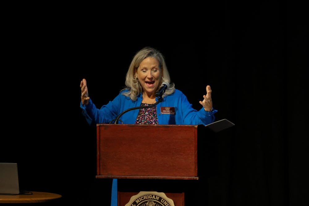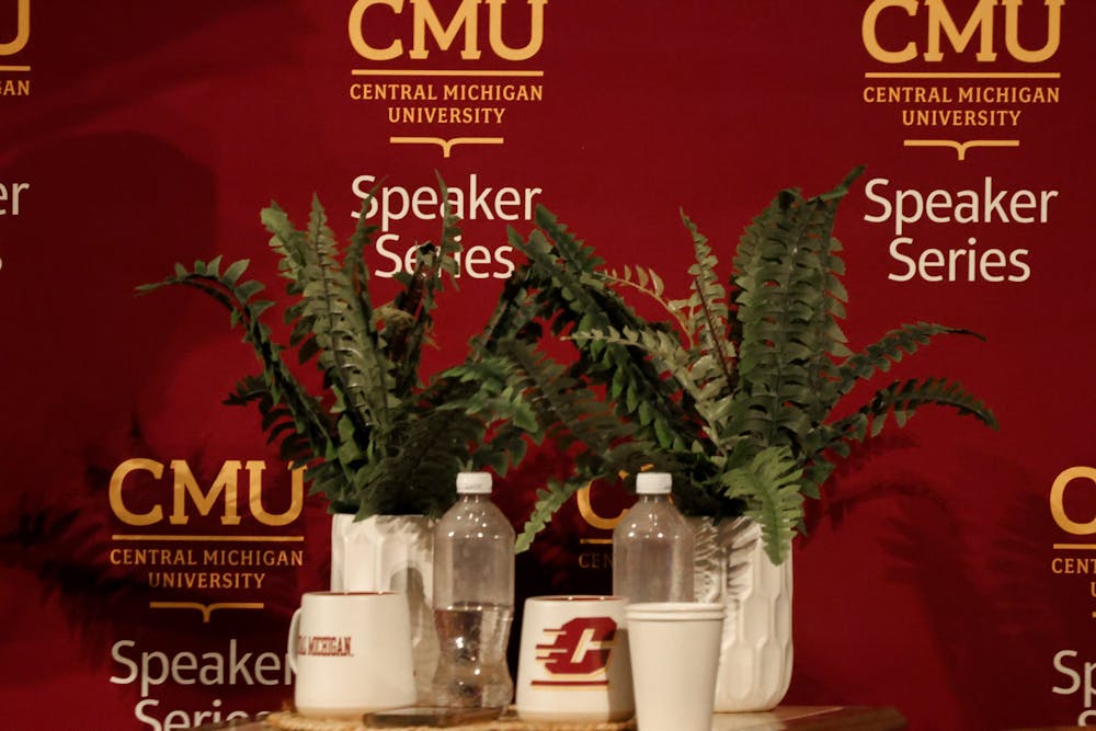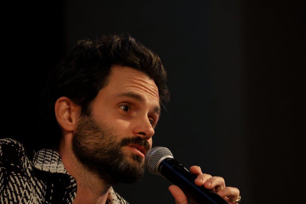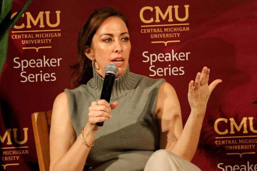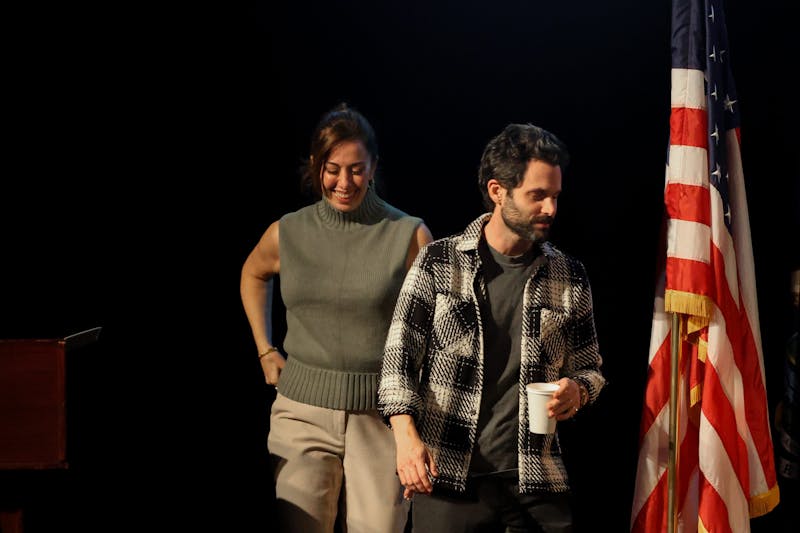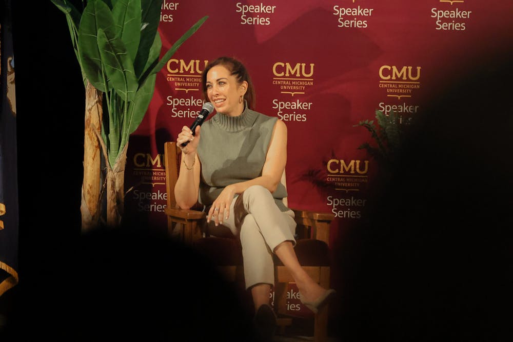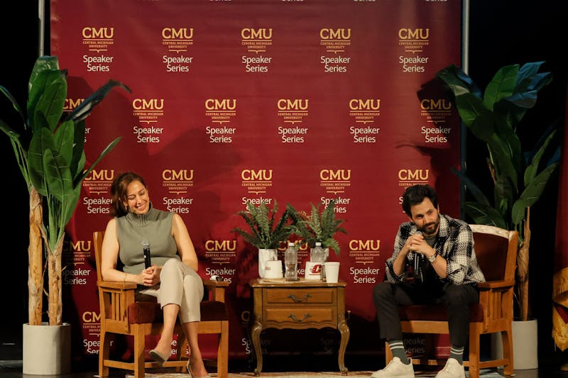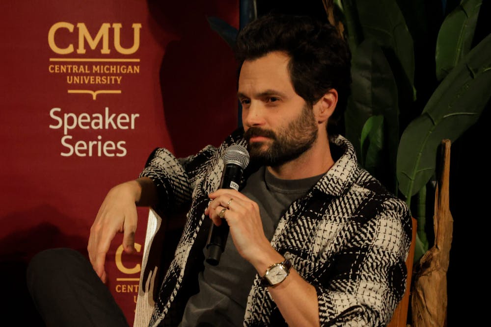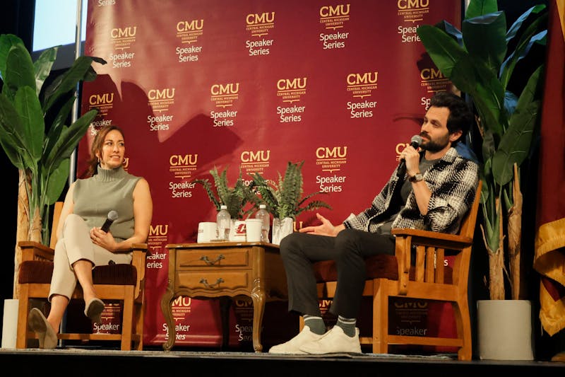 Central Michigan University hosts actor Penn Badgely, most known for his roles in "Gossip Girl" and "You," along with Arizona State University psychotherapist Dr. Nura Mowzoon in Plachta Auditorium, Thursday, Nov. 19, 2025. Mowzoon and Badgely created a dialogue that dove into social change and media.