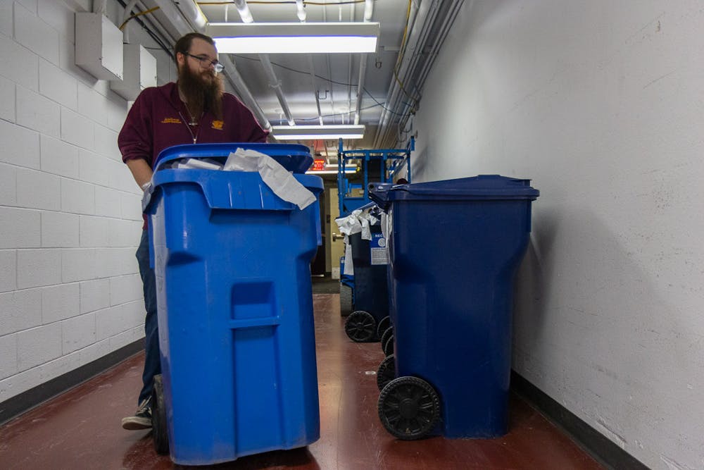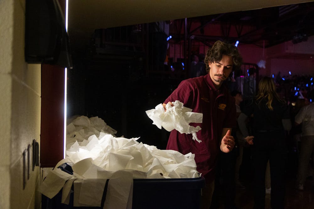 As fans shift their focus the matchup against Bowling Green State University, staff continue to clear the floor. They hoist an enormous amount of toilet paper into large recycling bins which are later wheeled off into a separate hallway. Only then can staff take a breather and enjoy the game.