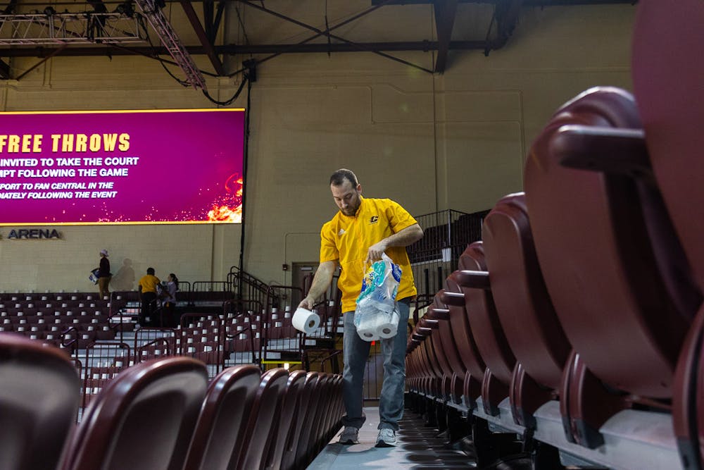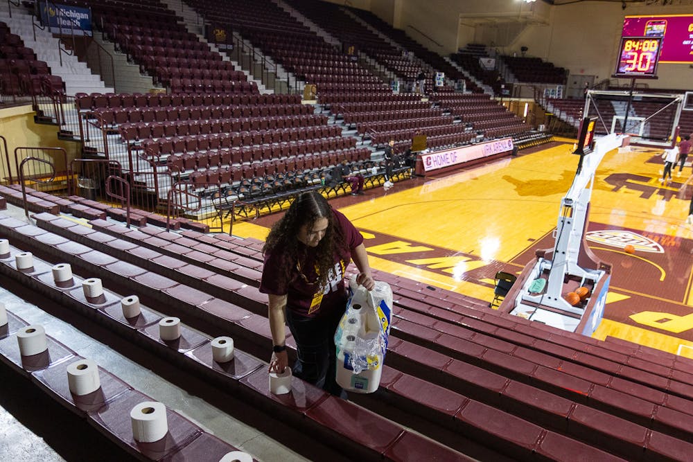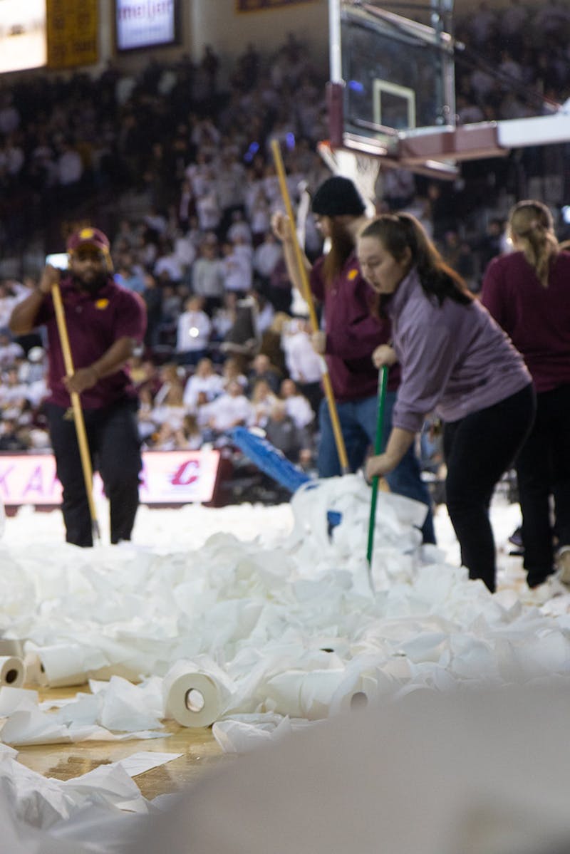 When it comes to Central Michigan University's annual "Toilet Paper Toss" basketball game, there's much more going on behind the scenes than one might think. CMU Athletic staff and students arrived to McGuirk Arena nearly five hours before tipoff to start preparing the venue for what is easily the most-anticipated game of the mens basketball season.