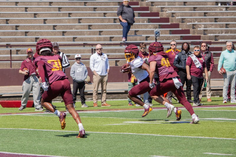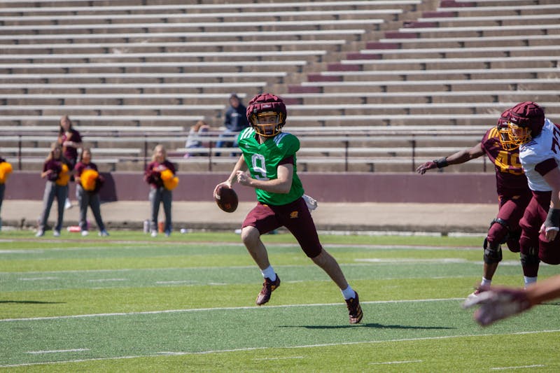 The Central Michigan University football team hosts a spring game for the first time since 2018 to showcase their progress preparing for the next season under the new head coach, Matt Drinkall, in Kelly/Shorts Stadium on Saturday, April 12, 2025. The team was divided into team Deromedi (defense) and team Kramer (offense) for the game.