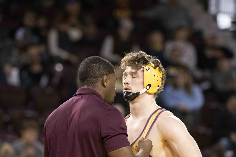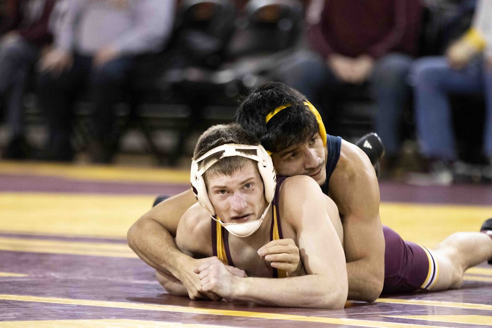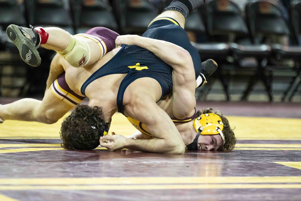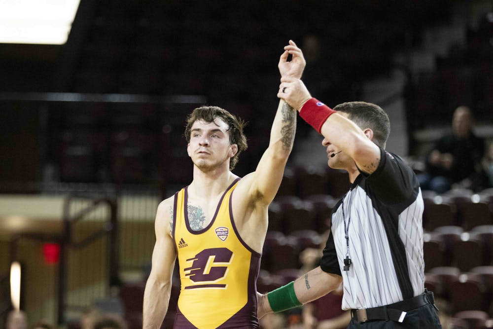 The Central Michigan Chippewas fell to No.13 the University of Michigan 34-6 at McGuirk Arena, Sunday, Feb. 22, 2026. Central Michigan took home victories from Andrew Austin and Luke Cochran against the Wolverines and were honored before the match along with the other six graduating Chippewas.