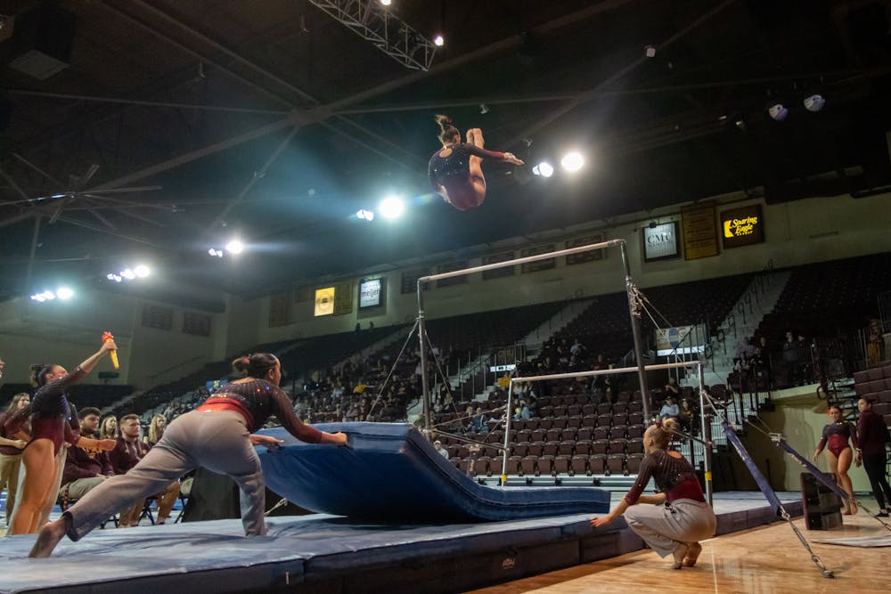 A Central Michigan gymnast practices on uneven bars at McGuirk Arena, Friday, Feb. 14, 2025. Central Michigan scored 49.050 points in the event. (CM-Life | Mark Hoover)
