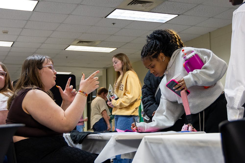 Central Michigan University freshman Emily Fuhrmann engages with visitors while tabling at Passion Palooza in Kulhavi Hall on Wednesday, April 8, 2026. (CM-Life | Cristin Coppess)