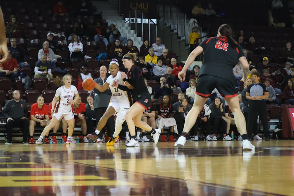 Central Michigan University fifth year forward Zareia Chevre passes the ball to a teammate during a basketball game against Ball State University at McGuirk Arena on Wednesday, Jan. 28, 2026. Chevre scored a total of three points with three rebounds. (CM-Life | Jasmine Brookins)