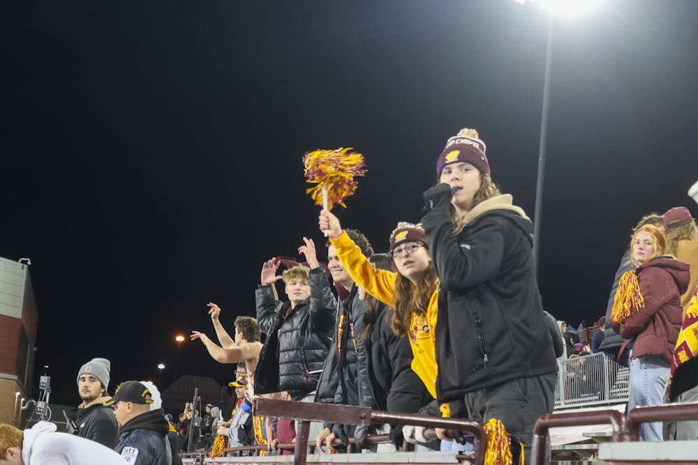 The Central Michigan University student section brings the energy as the clock runs down in the last seconds of the game at Kelly/Shorts Stadium on Wednesday, Nov. 12, 2025. Despite cold weather fans still showed out cheering the team on. (CM Life | Jasmine Brookins)
