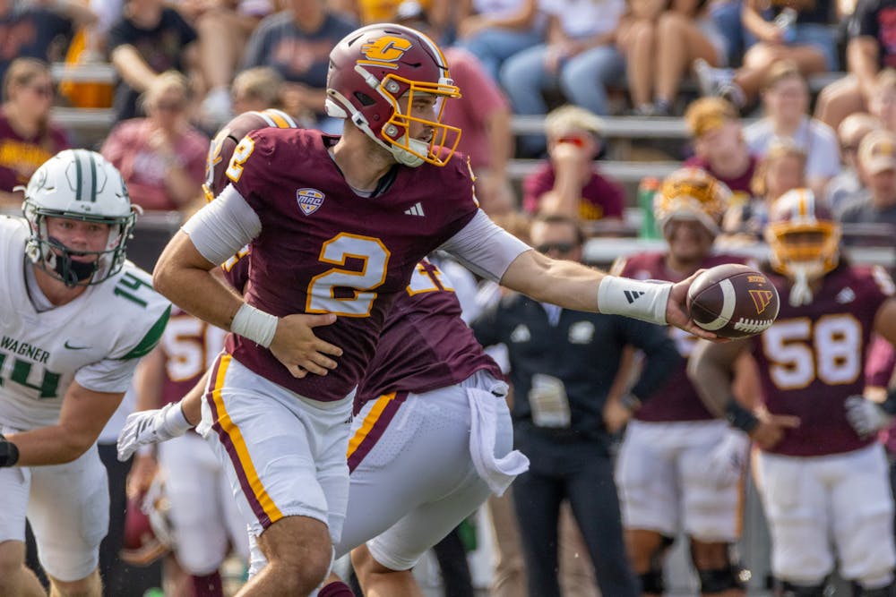 Central Michigan redshirt senior quarterback Joe Labas hands the ball off to a CMU running back at the CMU vs Wagner football game at Kelly/Shorts Stadium, on Saturday, Sept. 19, 2025. (CM-Life | Mark Hoover)