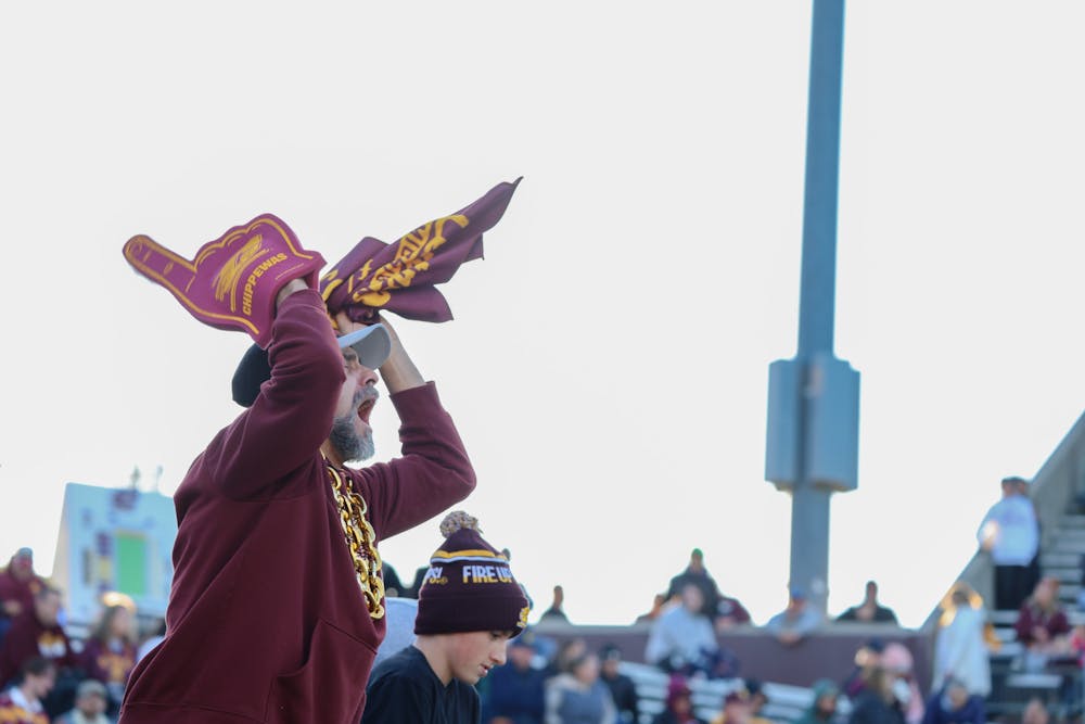 A Central Michigan University fan cheers for the team during a time-out at Kelly/Shorts Stadium, on Saturday, Oct. 25, 2025. Fan Central provides fans with lots of gear to show their support. (CM Life | Jasmine Brookins)