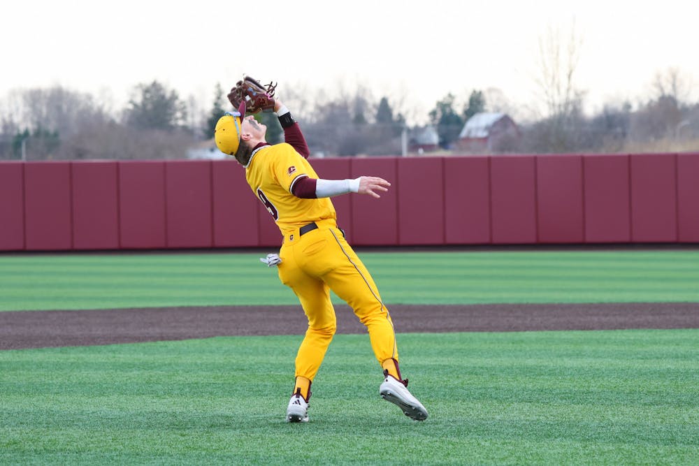Central Michigan University redshirt junior infielder/outfielder Bryson Webb catches an up ball hit by a Western player at the baseball game at Keilitz Field at Theunissen Stadium on Friday, April 3, 2026. Webb scored one run on one hit. (CM-Life | Jasmine Brookins)