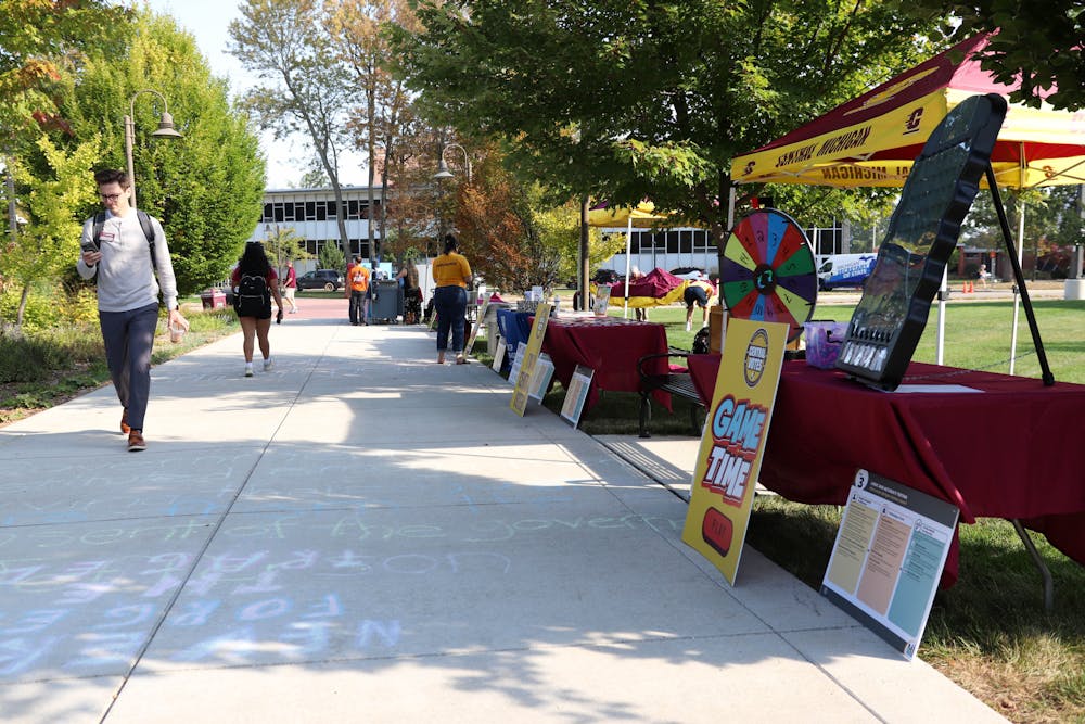 Central Michigan Central Votes program puts up stands for students to play games and eat food at the park library lawn, Tuesday, Sept. 16, 2025. Students are encouraged to participate in spin the wheel trivia and grab walking tacos throughout the event. (CM-Life | Mary Nowosacki)