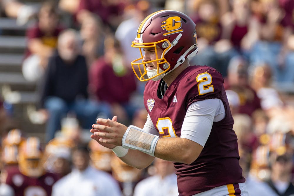 Central Michigan redshirt senior quarterback Joe Labas snaps the ball at Kelly/Shorts Stadium, on Saturday, Sept. 19, 2025. (CM-Life | Mark Hoover)