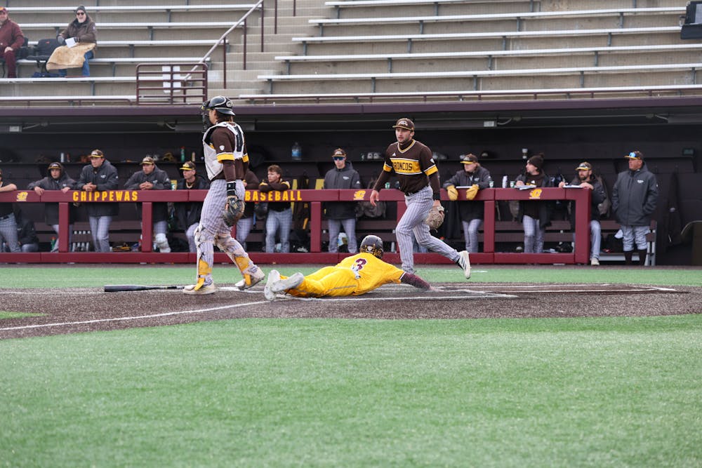 Central Michigan University redshirt freshman outfielder Dominic Bouscher slides to home base securing a run after subbing in for redshirt senior catcher Spencer Verburg at the baseball game at Keilitz Field at Theunissen Stadium on Friday, April 3, 2026. Bouscher scored one run on zero hits. (CM-Life | Jasmine Brookins)