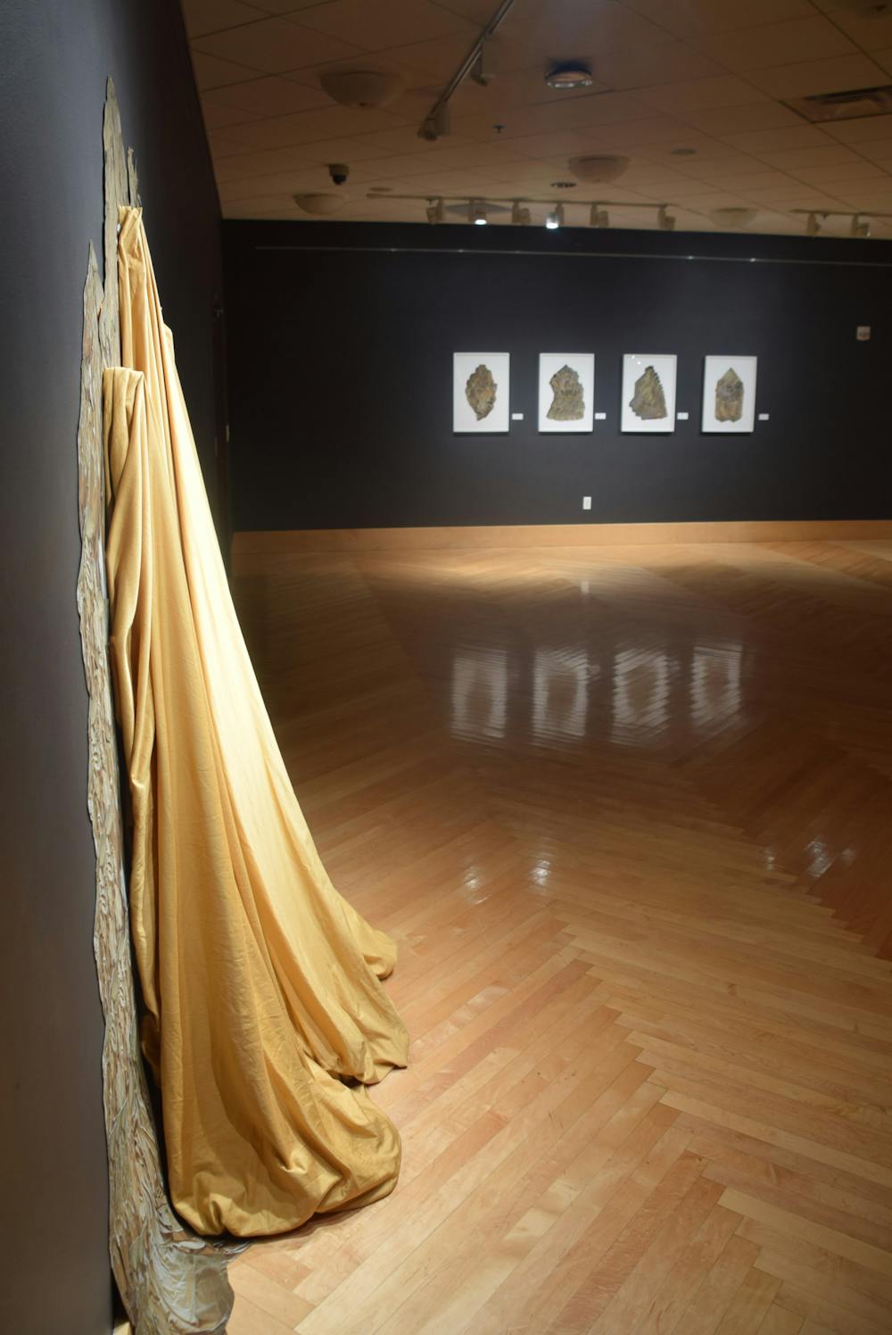 Fabric from Mira Burack’s installation ‘Family of Gold’ pools onto the gallery floor in the exhibition Sleeping in the Mine, displayed in the Baber Room Gallery. Courtesy of Baber Room Gallery staff.