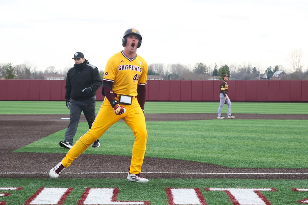 Central Michigan University senior outfielder Cole Prout celebrates hitting a home run at the baseball game at Keilitz Field at Theunissen Stadium on Friday, April 3, 2026. Prout scored one run on two hits. (CM-Life | Jasmine Brookins)