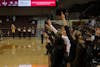The Central Michigan University women’s basketball team celebrates sophomore guard Jayda Mosley scoring a three-pointer during a basketball game against Akron at McGuirk Arena, Wednesday, Feb. 11, 2026. Mosley scored a total of five points against Akron. (CM-Life | Jasmine Brookins)