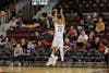 Central Michigan University sophomore guard Will Ashford looks for an open player to pass the ball to while running down the clock at the basketball game against Northern Illinois University at McGuirk Arena on Saturday, Feb. 14, 2026. Ashford scored two points against the Huskies. (CM-Life | Jasmine Brookins)