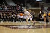 Central Michigan University junior center Taylor Johnson scores a layup during a basketball game against the University of Akron at McGuirk Arena on Wednesday, Feb. 11, 2026. Johnson scored four points, with two rebounds. (CM-Life | Jasmine Brookins)