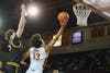 Central Michigan University sophomore forward Keenan Garner goes for a layup also getting fouled at McGuirk Arena, Monday, Nov. 3, 2025. Garner played 23 minutes of the game scoring nine points.(CM Life | Jasmine Brookins)